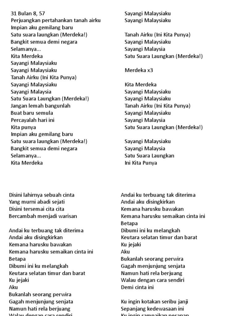 Satu suara laungkan Merdeka Bangkit semua demi negara Selamanya Kita Merdeka Sayangi Malaysiaku Sayangi Malaysiaku Tanah Airku Ini Kita Punya Sayangi Malaysiaku Sayangi Malaysia Satu Suara Laungkan Merdeka Jangan lemah. Keranamu kami hidup selesa. 31 Bulan 857 Perjuangkan pertahankan tanah airku.