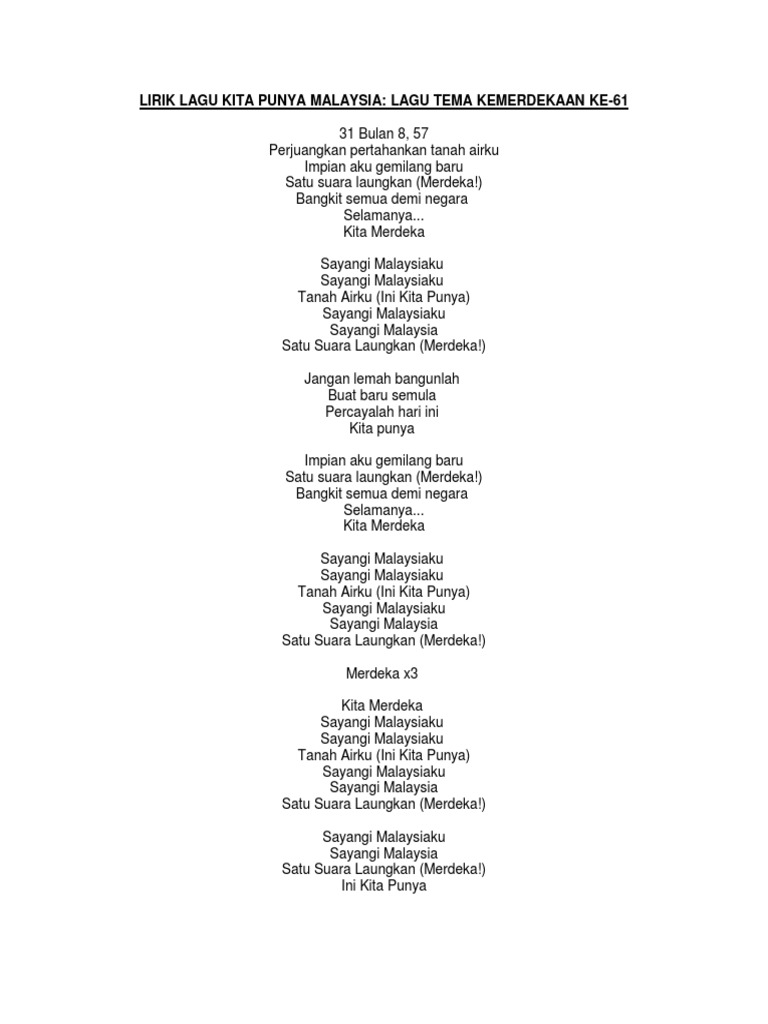 Lirik Lagu Rasmi. Lirik Lagu 1 Malaysia Koir Pelajar. Lirik Lagu Lirik Lagu Kita Punya Malaysia - Lagu Tema Hari Kemerdekaan 2018.